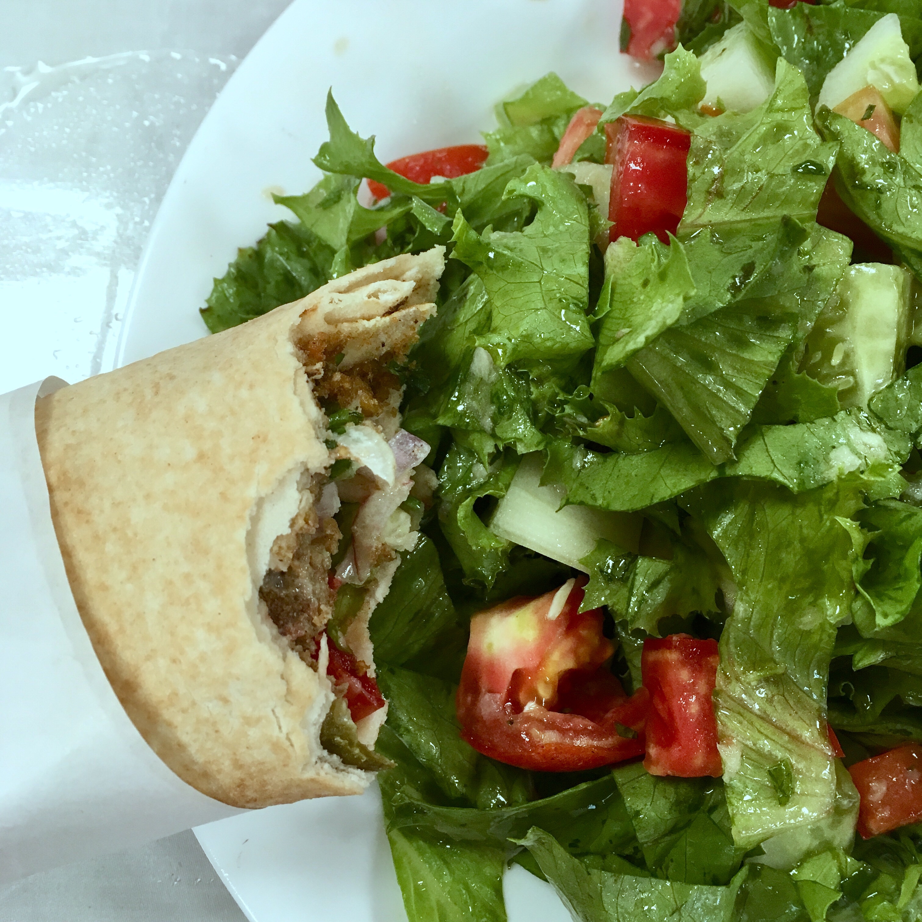 Le mien? Le pain pitta et les falafels: l’un est fait à base de farine blanche, l’autre est frit. Mais j’adore et quand je le prend, c’est toujours avec de la salade!