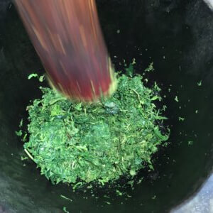 • Il faut ensuite mettre les feuilles légèrement ramollies dans un mortier propre.