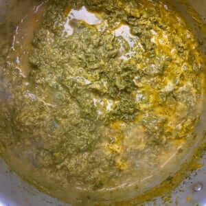 • Ensuite il faut faire chauffer brèvement les feuilles de manioc dans une casserole pendant 5 min, dans le fond d’eau restée sur les feuilles rincées.