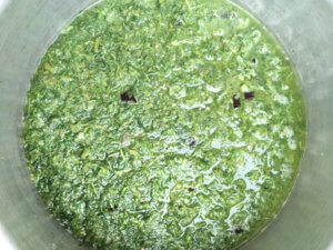 • Au fur et à mesure qu’on pile les feuilles, il faut ajouter progressivement dans le mortier les autres ingrédients coupés grossièrement.